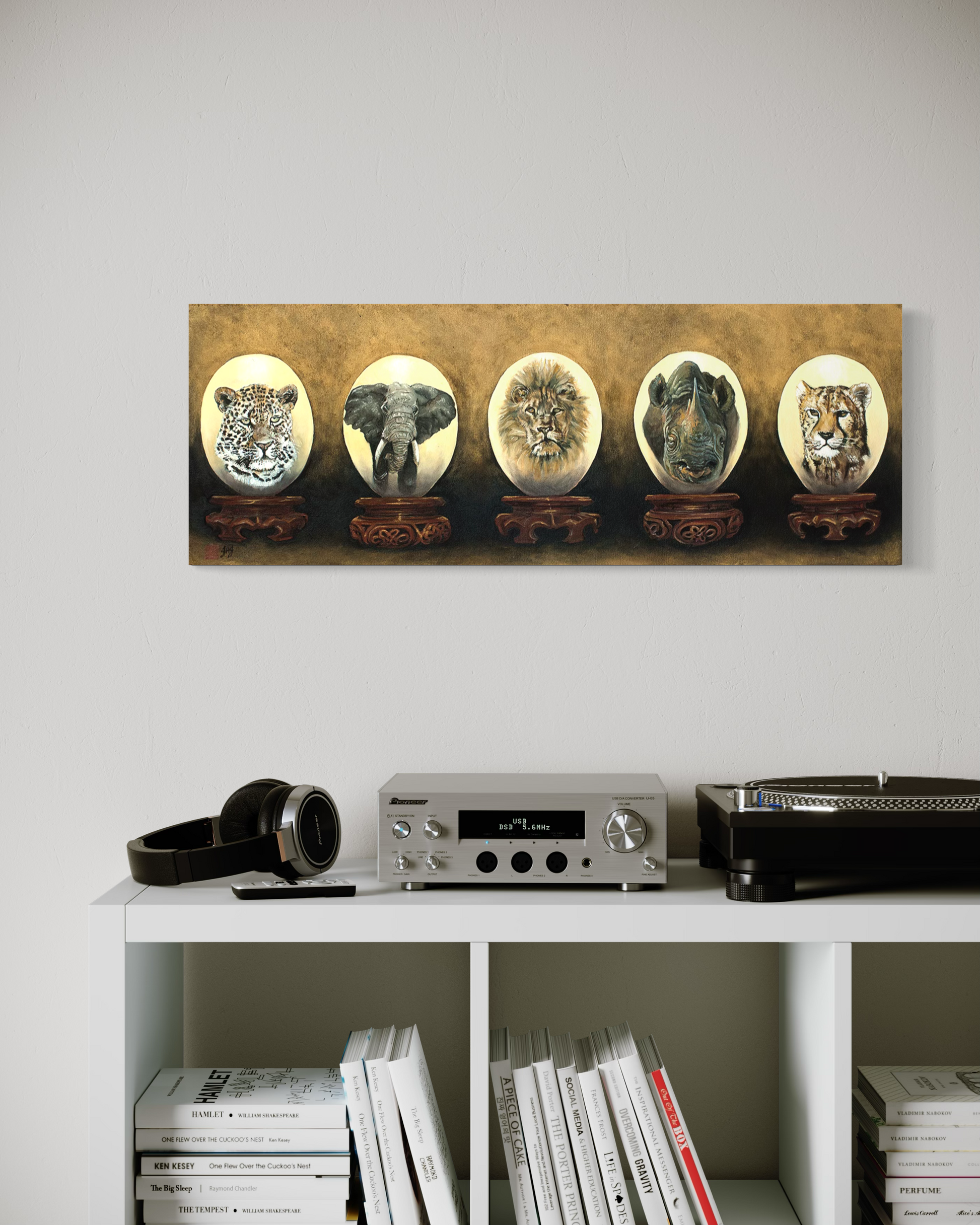 I have five Ostrich eggs in a basket. I have always wanted to use them for something. But did not want to destroy the lovely shape and feel of them. Then the idea of the Big Five came to me. But, how to present them. Having lived in Hong Kong, I had an impulse buy of the five bases.