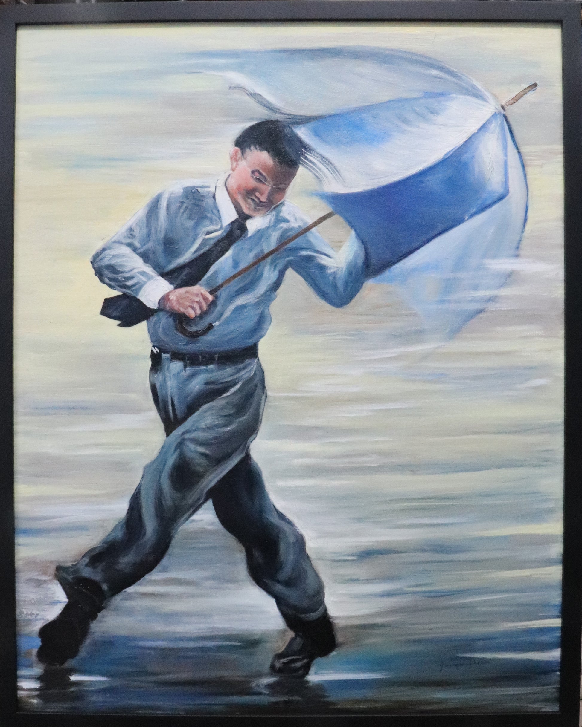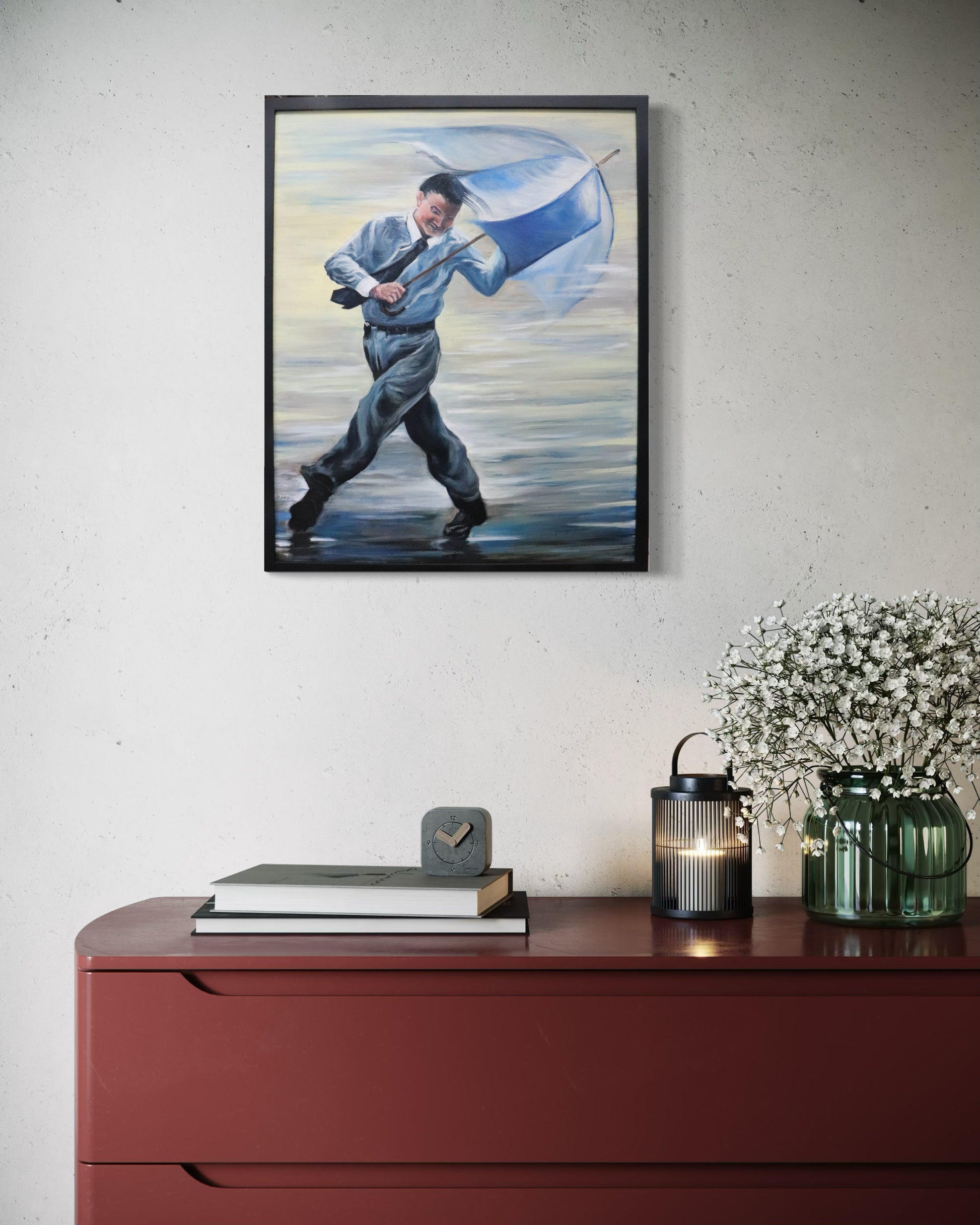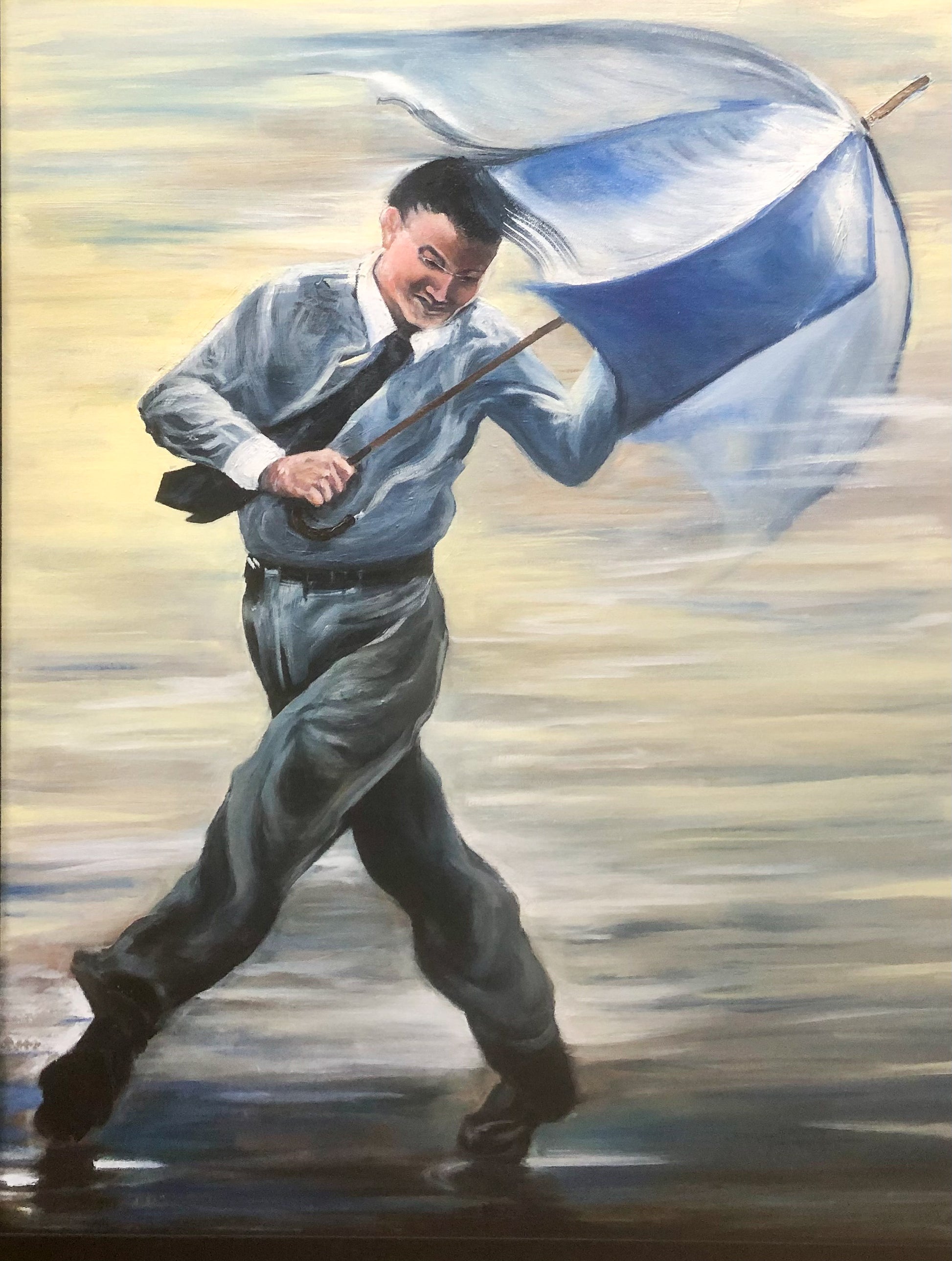 The wind, the rain, the business man being blown across the street, the umbrella nearly taking off. Loved the movement, wanted to catch it with my paint brush