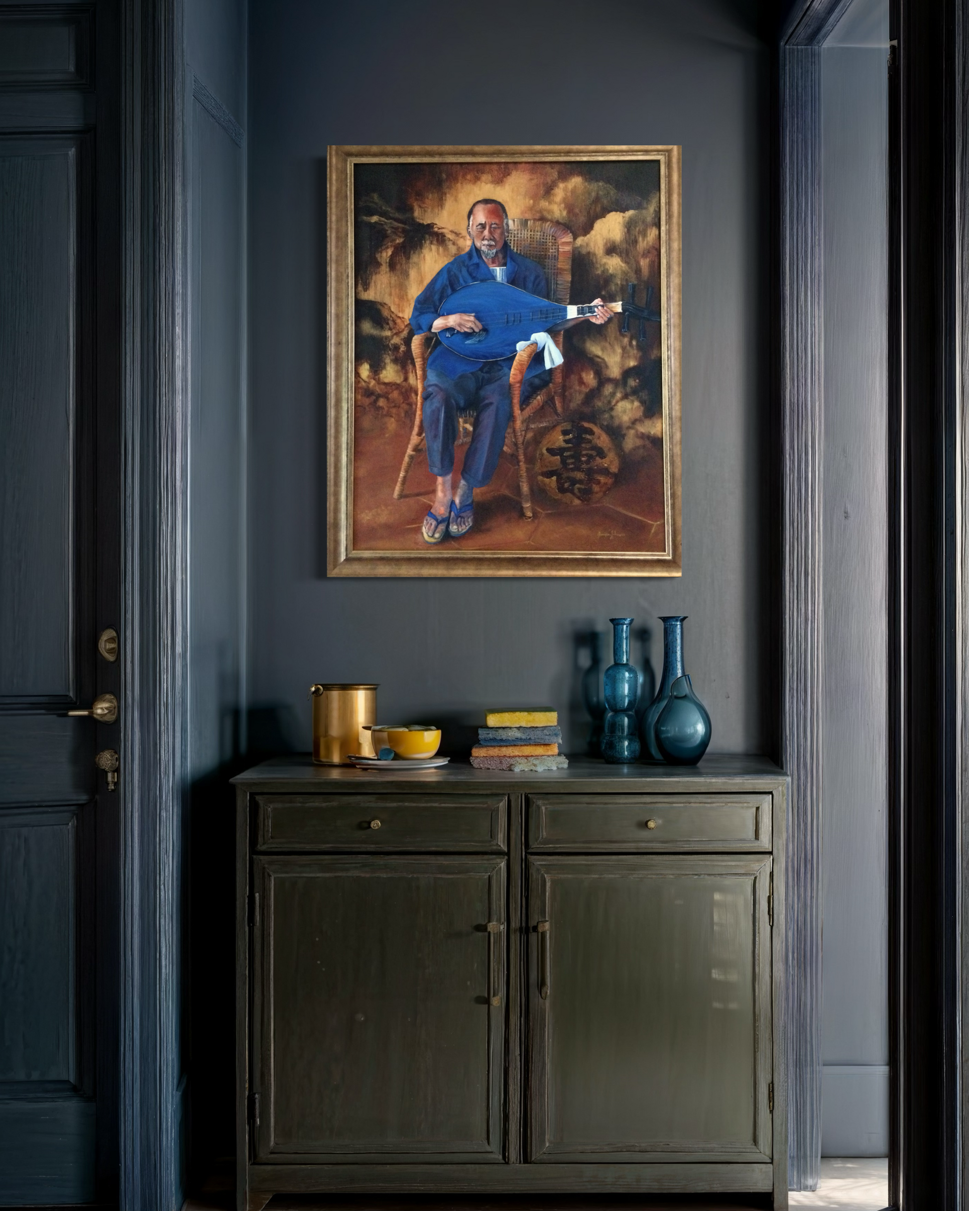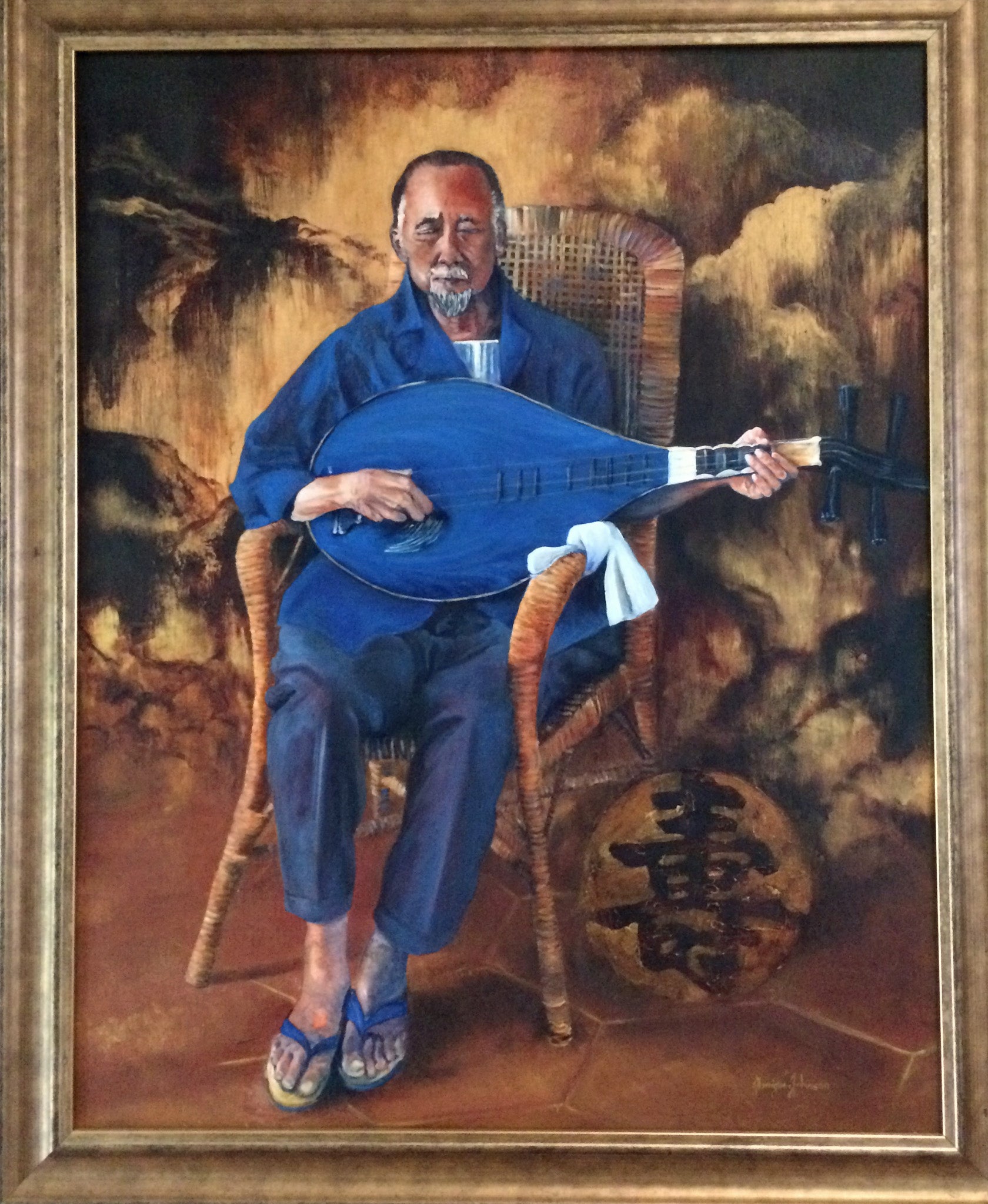 The Pipa, sometimes called a Chinese Lute. The musician is wearing a blue traditional Chinese work wear. The background I wanted to be golden hills. The sign is for longevity.
