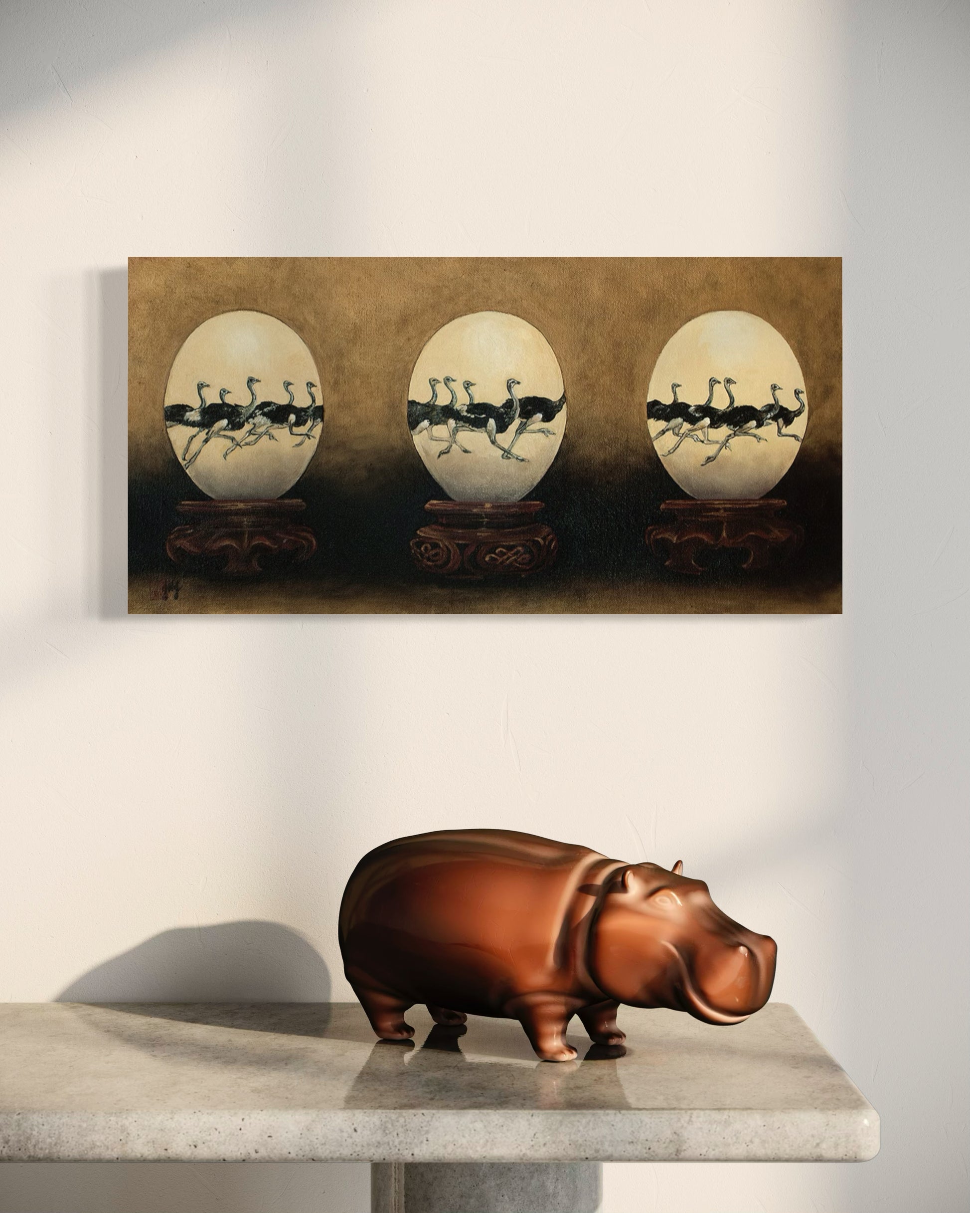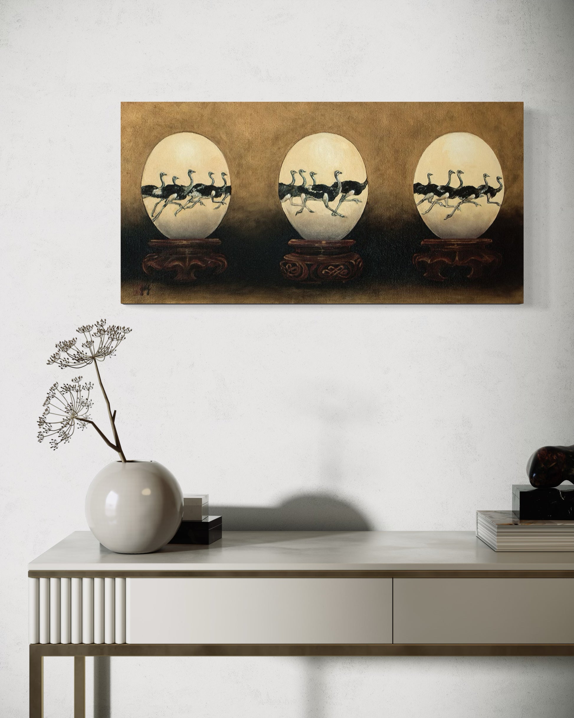 On a trip back to Zimbabwe, the country of Rhodesia I grew up in. I was given a gift of 6 ostrich eggs. Sadly the farm they originated was taken over by Mugabe, the export Protea crop destroyed and the Ostrichs had their legs cut. They have travelled with me as we moved around the world. Sadly I only have four whole ones left. My wish to record them for prosperity, so came up with the concept of 'Run Ostrich Run'